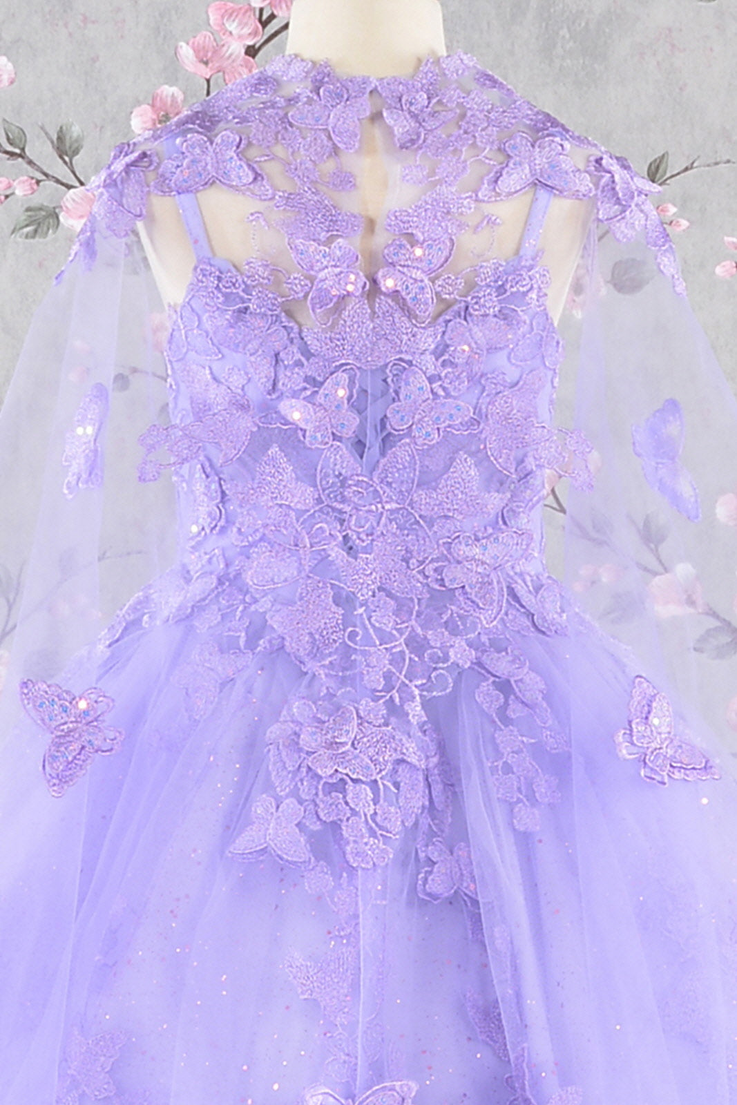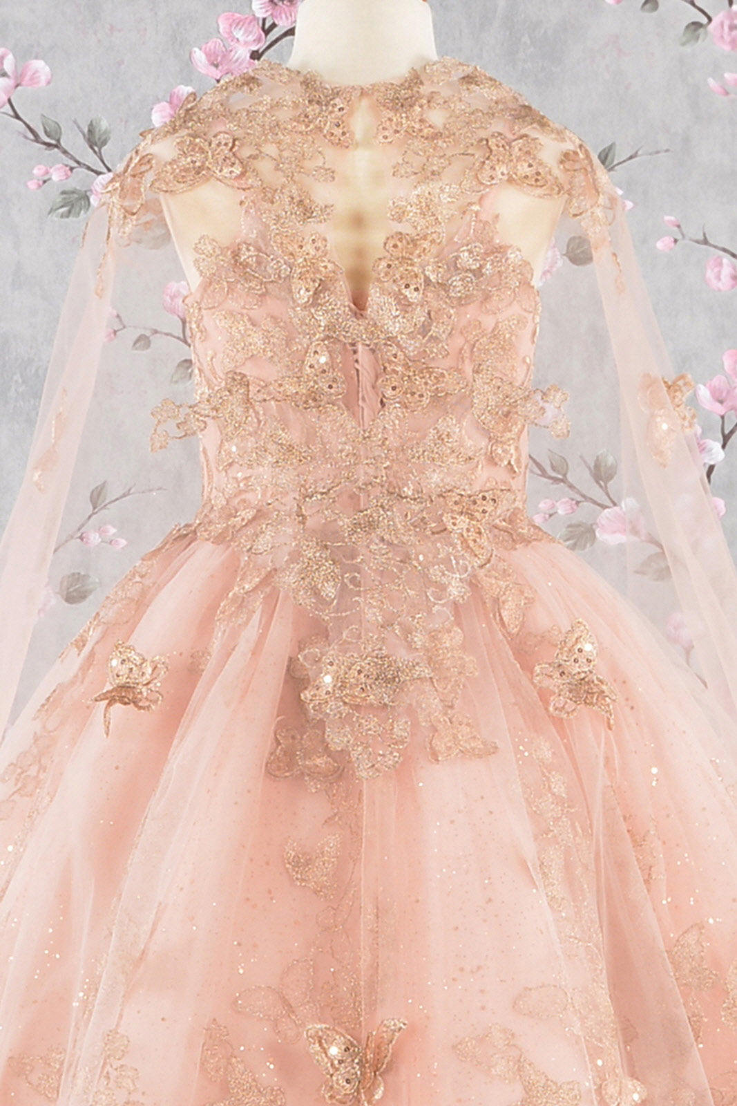 3D Butterfly Sheer Bodice w/ Long Mesh Cape Quinceanera Dress GLGL3171