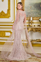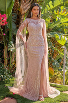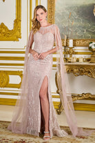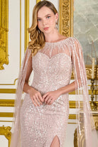 Floor Length Beaded Pageant Gown w/ Long Cape Sleeves & Boat Neckline GLGL3831
