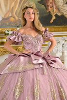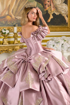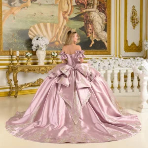 Formal Soft Satin Quinceanera Gown w/ Ruffled Cuff Sleeves & Gold Lace Embroidery GLGL3803