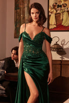 Midnight Teal Off-Shoulder Satin Gown with Beaded Corset & High Slit CDS532