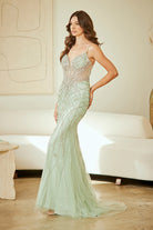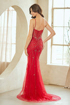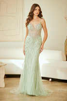 This Prom Dress delivers a high-end couture appearance without the hefty price. Adorned with intricate geometric beading and dazzling rhinestones meticulously laid over sheer mesh, it sculpts a striking hourglass silhouette that commands attention. The daring deep plunging V-neckline combined with a sweeping full-length train amplifies its dramatic flair, perfect for making an unforgettable entrance. Designed to captivate, this gown transforms prom nights, pageants, and galas into unforgettable moments, effortlessly turning heads and sparking envy with its radiant sparkle and flawless fit. Dare to shine like never before.