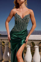 Strapless Beaded Corset Gown with High Slit & Satin Drape Skirt CDCDS538