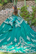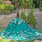 Command the room in this magnificent quinceañera gown that epitomizes timeless elegance and glamour. The strapless V-neckline corset bodice showcases intricate beadwork, sequins, jewels, and embroidery that catch light beautifully. Luxurious satin pleats define the bust, crowned with a stunning central brooch for added sophistication. Layers of glittering tulle with scalloped embroidered hems build volume and drama, extending gracefully into an impressive train. A detachable satin back bow provides the perfect finishing flourish. Elevate your ensemble with the included coordinating open-shoulder bolero, expertly embellished with matching details and adorned with elegant dangling beads that amplify your radiant presence.
