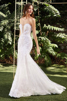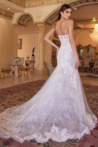 Stun your guests with this breathtaking dress, designed for the bride in pursuit of perfection. The fitted bodice with a sleeveless, strapless, deep V-neckline flatters the décolleté area of your body. The mermaid silhouette of the dress showcases your shape while an embellished patterned train trails behind you.
