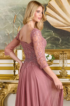 This refined A-line dress captures the essence of sophisticated elegance for the discerning mother of the bride or groom. Featuring a romantic sweetheart neckline and graceful 3/4 mesh sleeves, the intricately embellished bodice showcases beads, jewels, and sequins that catch the light beautifully. The skirt flows effortlessly in luminous metallic jersey, offering movement and grace while maintaining an air of understated glamour. A zipper closure ensures comfort and ease. Choose this gown when you want to look polished, radiant, and timelessly beautiful on one of life's most memorable occasions.
