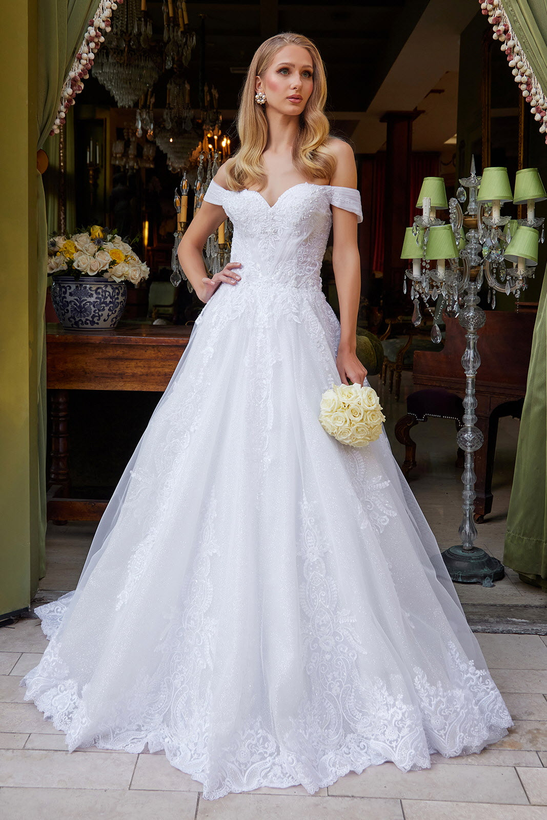 Off-shoulder straps that connect to a v-neckline bodice and flows into an A-line train skirt are enhanced with beads, sequins, and embroidery.