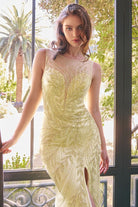 Embellished Sheer Illusion Gown with High Slit – Available in Blue & Yellow