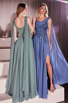 Sage Green Chiffon Gown with Embroidered Bodice and Side Slit