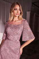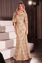 Gold Sequin Lace Evening Gown with Elbow Sleeves