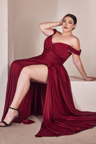Plus Size Burgundy Off-Shoulder Gown with Draped Bodice and Slit