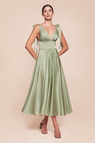 This elegant A-line tea-length dress features tie shoulder straps, a flattering V-neckline, and a gathered waistline for a timeless look. Crafted from soft satin, the fitted bodice flows into a graceful A-line skirt, offering both comfort and style. Perfect for bridesmaids, wedding guests, or formal events.