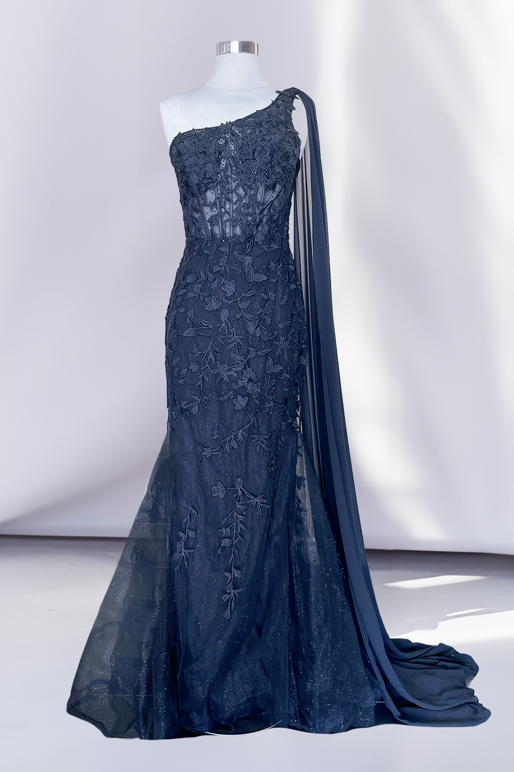 Make an unforgettable entrance in this stunning one-shoulder mermaid gown, expertly designed for evening elegance. The sleek silhouette hugs your curves before flowing gracefully to the floor, while intricate embroidered lace detailing adds refined sophistication. A dramatic side cape drapes from the shoulder, creating movement and dimension with every step. The secure zipper back ensures a flawless fit, while the sleeveless cut showcases your shoulders and neckline beautifully. Perfect for proms, galas, and formal events where you want to command attention with timeless glamour and contemporary style.