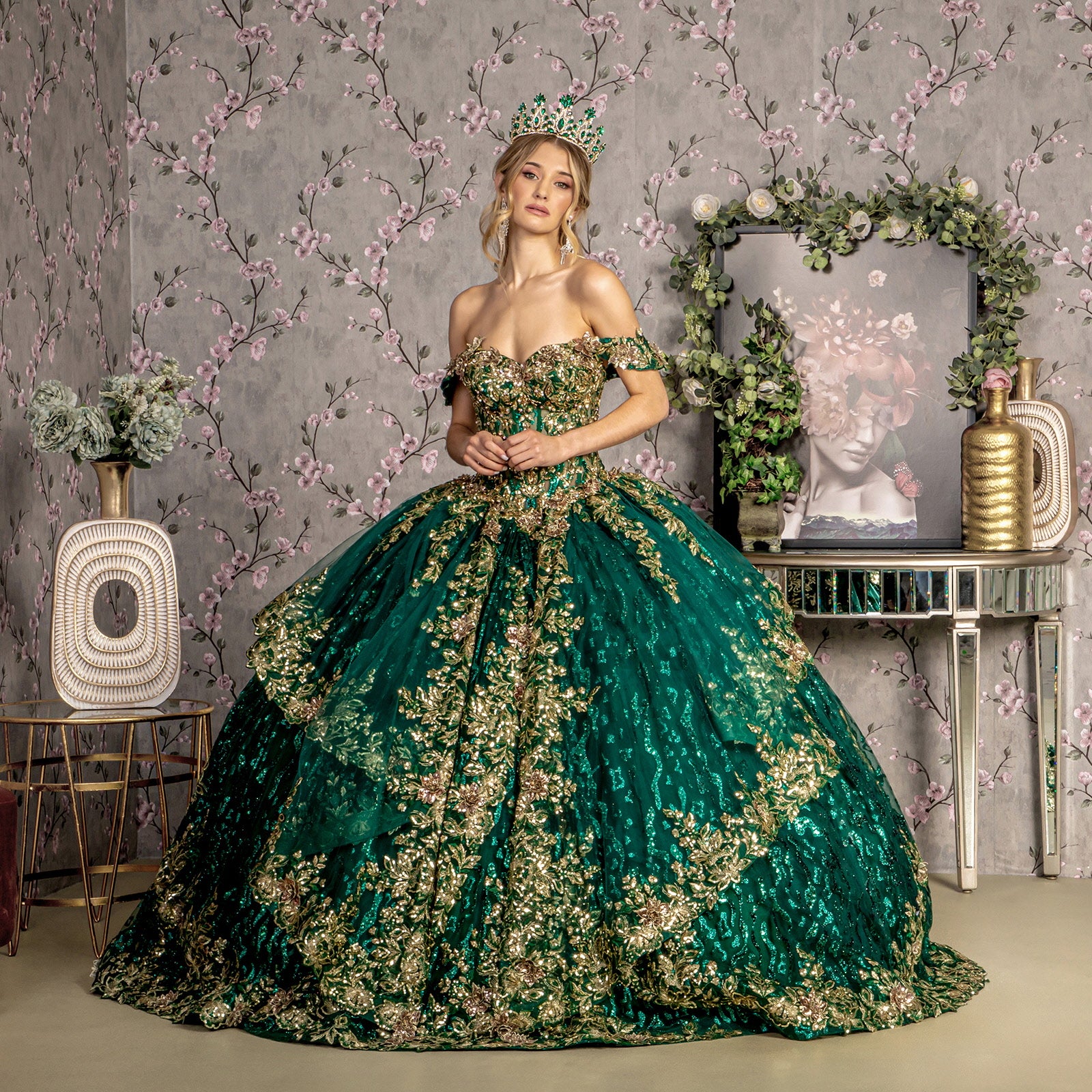 The applique, beads, glitter, and jewels add intricate embellishment that will catch the light and turn heads. The zipper closure and lace up back make it easy to wear and adjust to your liking. With a ball gown silhouette, this dress is perfect for any formal event.