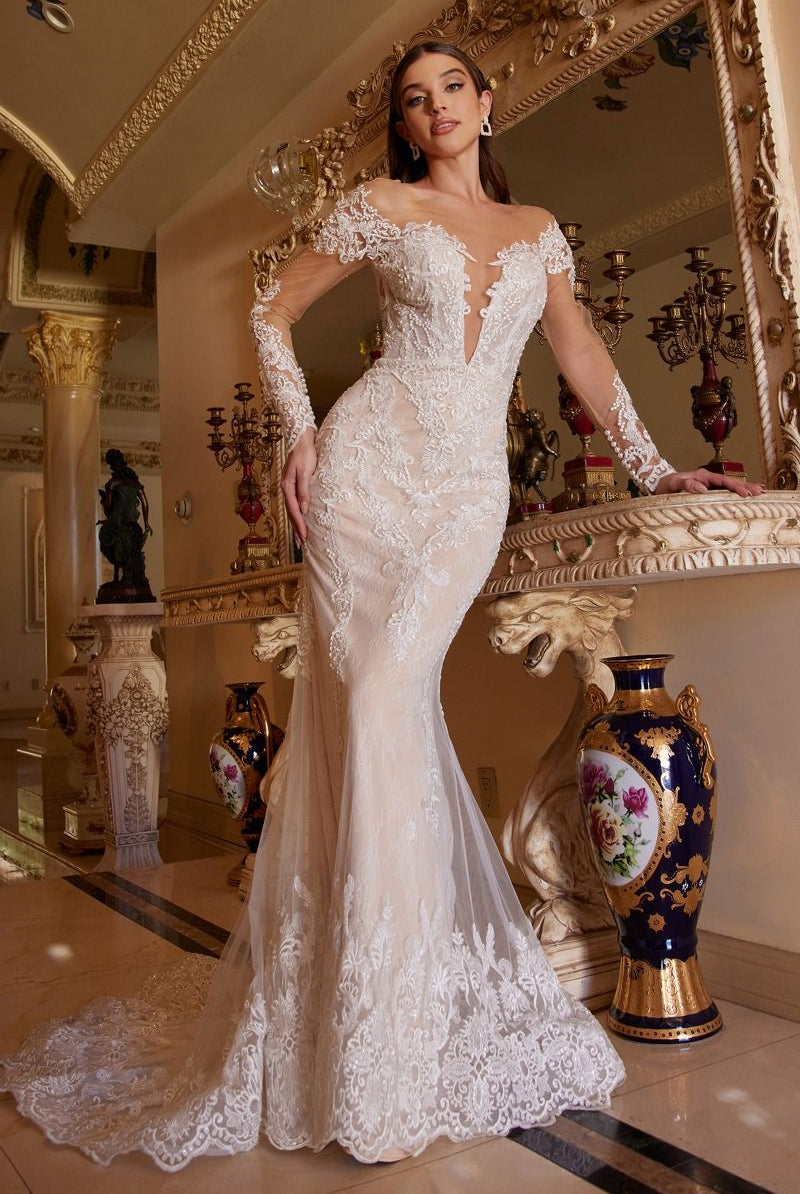 The V-neck deep sleeveless dress for brides with the possibility of adding bridal jewelry is the best choice for modern and elegant brides who want to make a statement on their wedding day. This sheer style not only emphasizes the neckline but also adds a hint of elegance to the entire outfit.