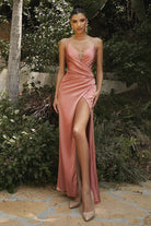 Fitted Satin V-Neckline Illusion Side Cut Outs Leg Slit Long Prom CD 7489