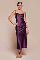 Elevate your evening wardrobe with this sophisticated satin sheath dress, expertly designed for refined occasions. The luxurious cowl neckline drapes elegantly while adjustable tied straps provide secure, flattering support. A midi length silhouette features a semi-open back and strategic side slit, balancing modest coverage with contemporary allure. Crafted from premium satin fabric, this sleeveless dress offers a polished, streamlined fit that flatters diverse body types. Perfect for cocktail events, galas, or upscale dinners, this versatile piece transitions seamlessly from day to evening. The sheath construction accentuates your natural curves while maintaining understated elegance. An investment piece that delivers timeless style and confidence.