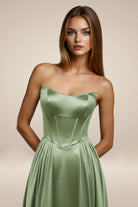 Elevate your bridal party with this sophisticated satin bridesmaid dress. The sleek A-line silhouette flatters every figure, while the scoop neckline offers timeless elegance. A structured boned bodice provides support and definition, and the strapless design showcases the shoulders beautifully. The floor-length cut creates a graceful, formal appearance perfect for any wedding. Detachable straps offer versatility, allowing you to customize the look to suit your preference. This refined piece seamlessly transitions from ceremony to reception.