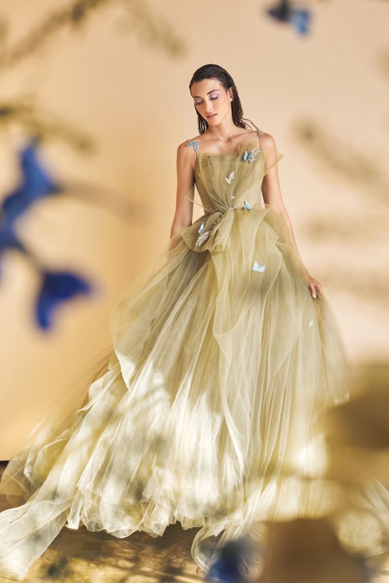 This dress is designed to be flirty, feminine, and fun. Showcasing a playful print of dancing butterflies throughout the body, it is a lightweight and comfortable option for special occasions such as weddings or prom.