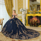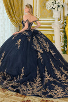 Radiate elegance in this stunning special occasion gown that seamlessly blends luxury and refinement. Crafted from premium mesh and satin, the sweetheart neckline and graceful off-shoulder straps create a timeless silhouette. The beaded corset bodice offers structured support while intricate gold lace embroidery adorns the bodice, adding opulent detail. Layers of flowing fabric cascade into a dramatic long ball gown skirt, embellished with shimmering rhinestones that dance with every step. The secure lace-up back ensures a flawless fit tailored to your frame. Perfect for quinceañeras, galas, and unforgettable celebrations where you deserve to feel absolutely radiant.