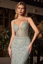 Nude Rhinestone Mermaid Gown | Sheer Corset Prom Dress with Spaghetti Straps & Sparkle Beading CD759