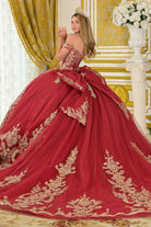 Gold Lace Embellished Floor Lenght Quinceanera Gown w/ Lace Up Back & Detachable Bow GLGL3673