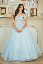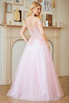 Romantic Off The Shoulder Long Prom Ball Gown w/ Beaded Corset Bodice & Lace Up Back AC8064