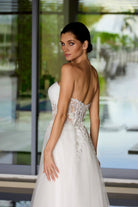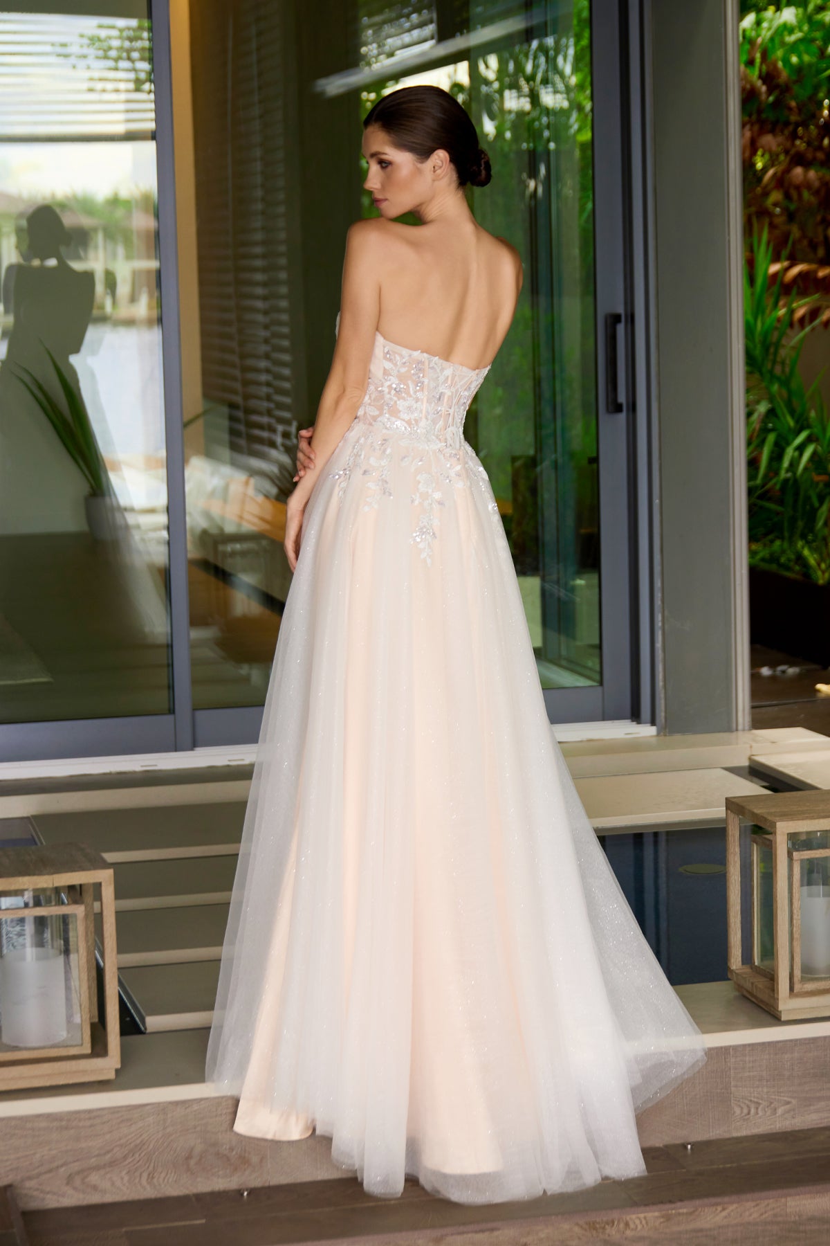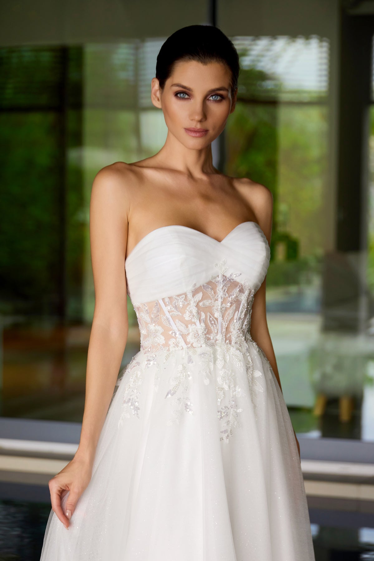 This stunning bridal gown combines contemporary elegance with timeless romance. Crafted from delicate mesh fabric, the strapless sweetheart neckline frames the shoulders beautifully while the sheer corset bodice features intricate floral appliqué and beadwork for added sophistication. The sleeveless silhouette flows into a graceful A-line skirt with layered construction, creating movement and dimension. A lace-up back detail adds both visual interest and a customizable fit. Perfect for the modern bride seeking a gown that balances ethereal femininity with refined style.