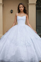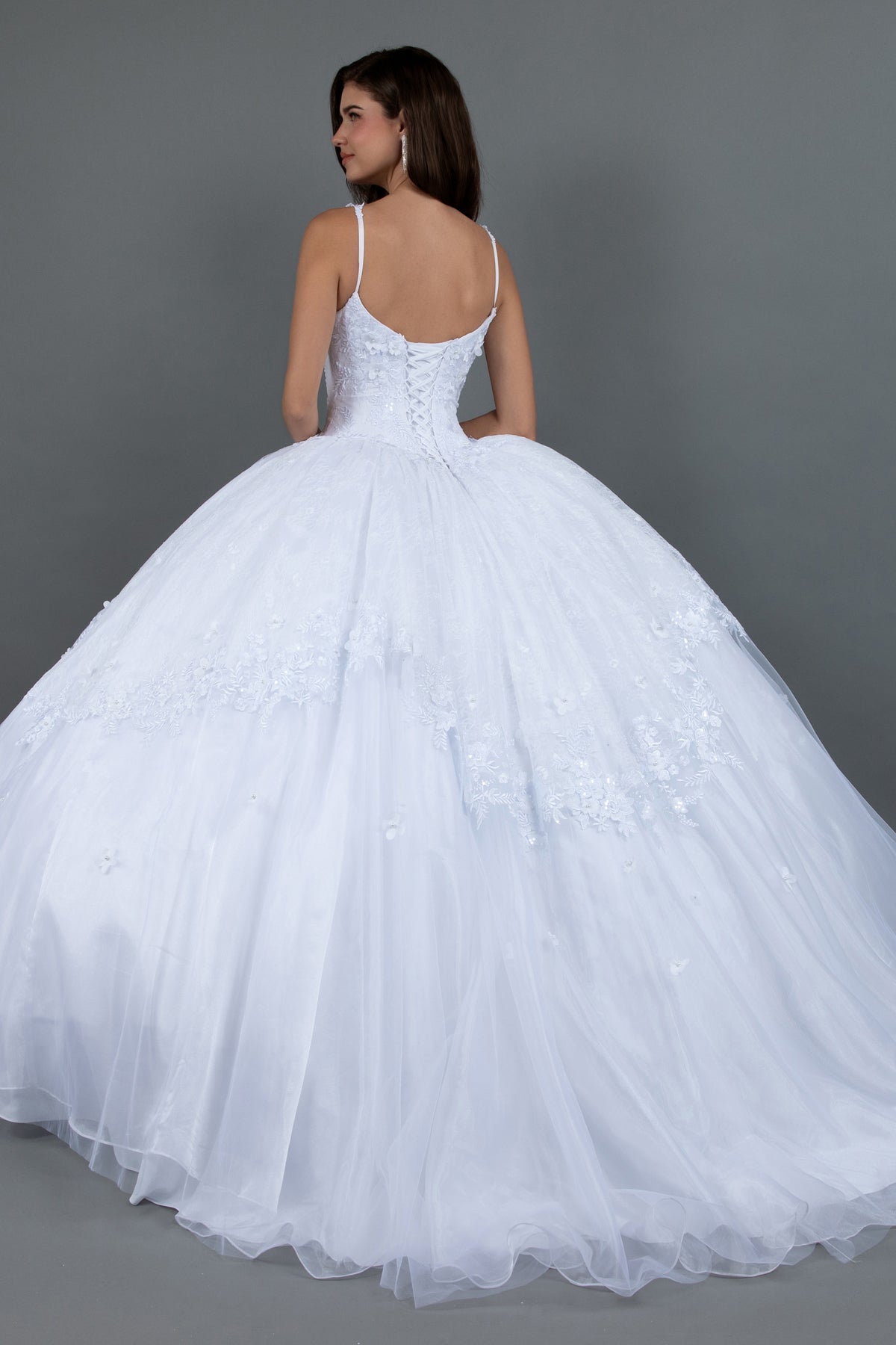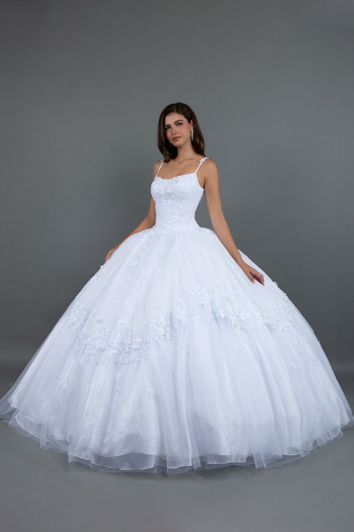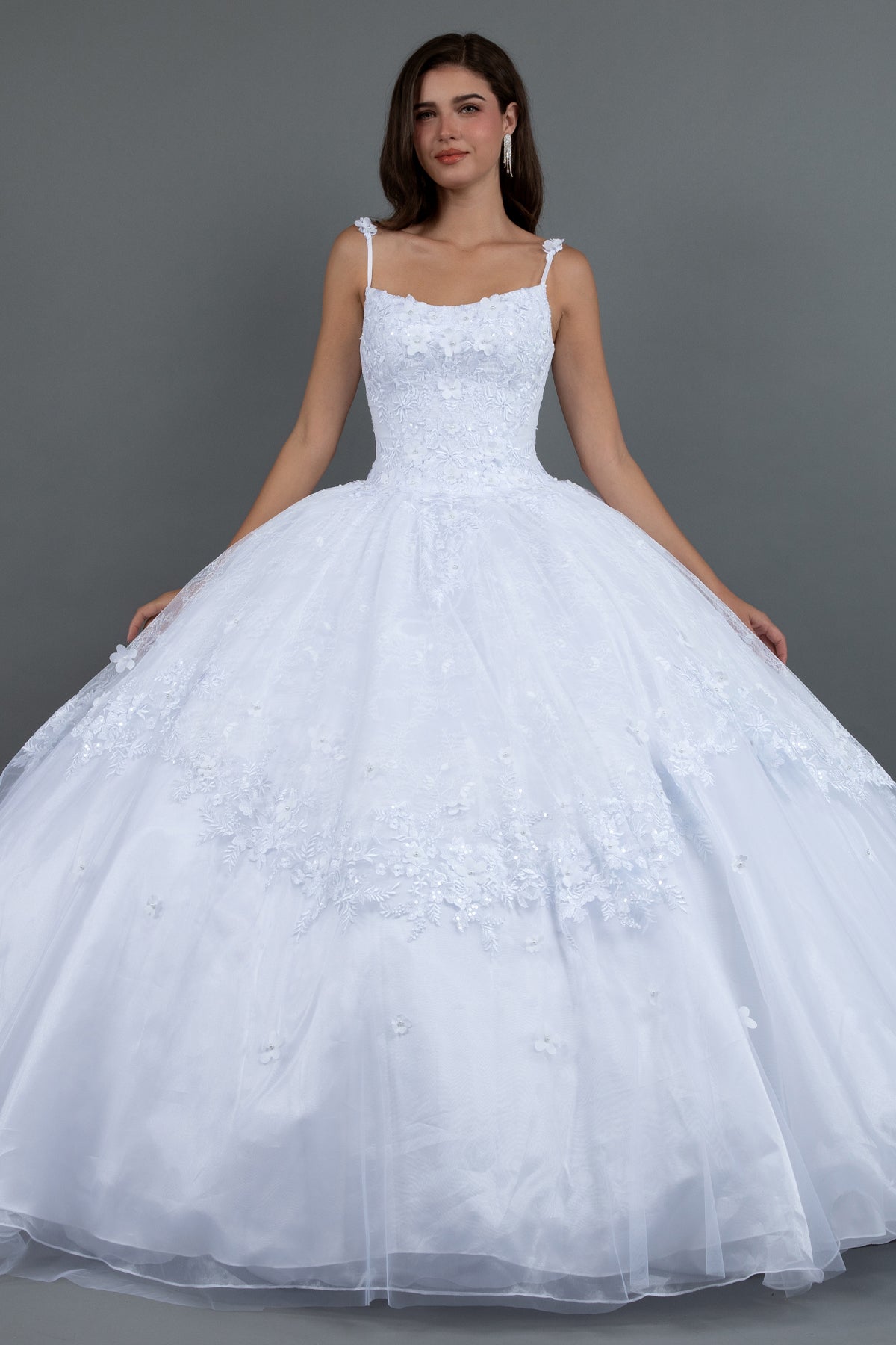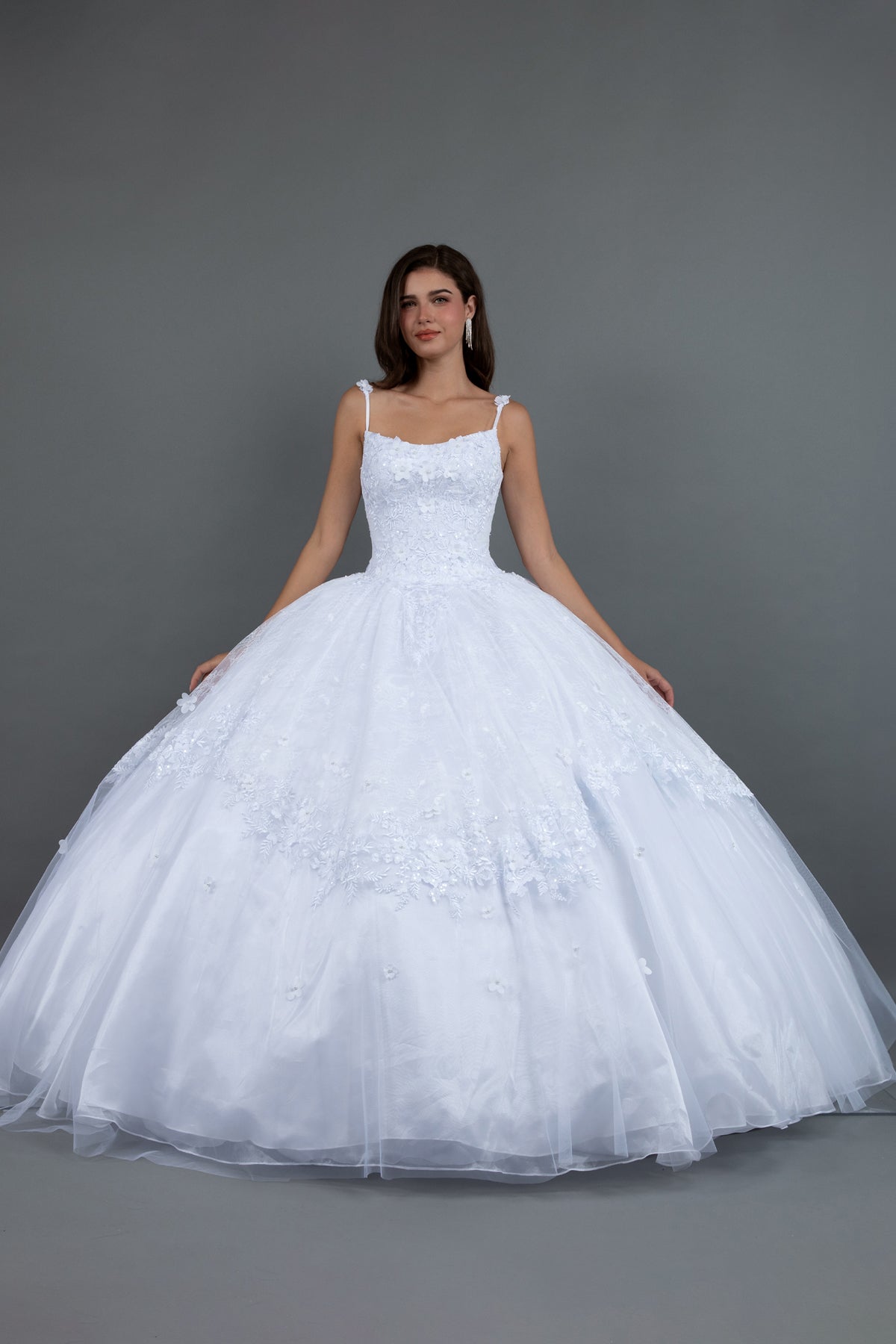 Sweetheart Bodice With Lace-Up Corset Back. Layered Tulle Skirt With 3D Floral Details. Matching Lace Straps And Lace Trim Hem.