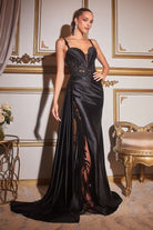 Emerald Green, Black, Ice Blue, Red Satin Illusion Gown with Beaded Bodice and Overskirt CDCDS417