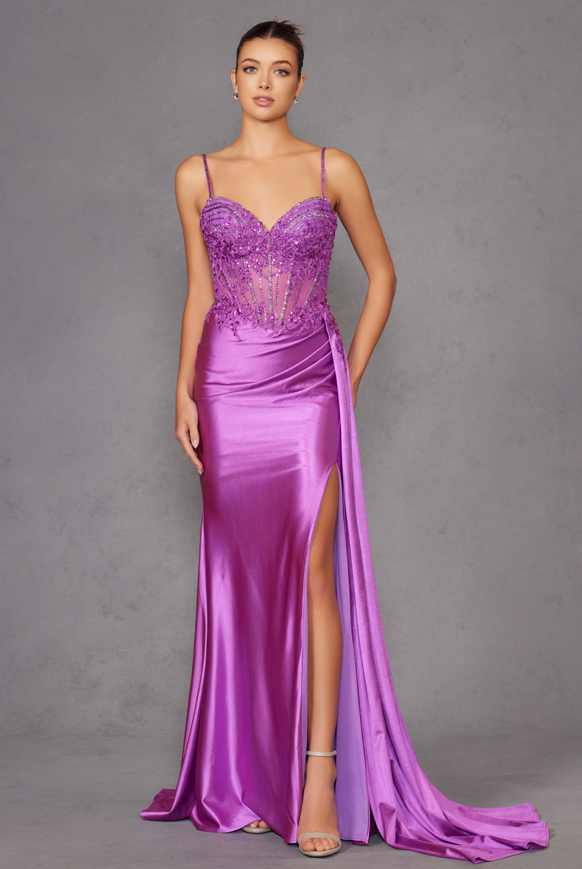 Details like backward shapes, ruching, and striped pattern dresses are expected to become more prominent. Stay one step ahead in fashion by providing customers with the most popular and leading trends, such as the Rhinestone Stretch Satin Gown.