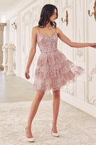 Lilac, Blue, Black | Tiered Lace Mini Dress with Tie Straps and Ruffle Skirt CDKV1090