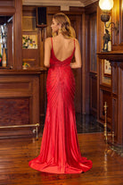 Command attention in this sophisticated fitted gown, featuring a classic V-neckline and delicate thin straps that lead into a breathtaking display of patterned beadwork. The directional layout of the beads is artistically designed to emphasize movement and contour the body, while the high front slit provides a daring yet elegant finish. With its low scoop back and smooth silhouette, this dress is the perfect choice for the modern woman looking to make a bold statement.