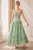 STRAPLESS FEATHER TEA LENGTH SAGE DRESS CDA1226