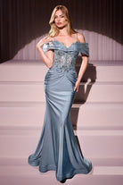 Step into a fairytale with this enchanting dusty blue formal gown, featuring a sheer illusion bodice adorned with 3D floral lace appliqués and shimmering beadwork. Delicate spaghetti straps lead into a structured corset-inspired top, while the silky satin skirt hugs the hips and gently flares into a graceful train. The elegant combination of textures creates a romantic and feminine look that’s made to captivate.