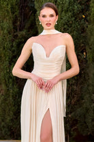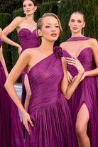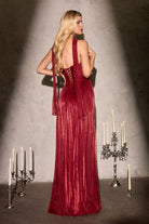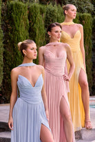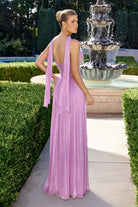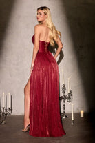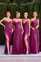 Stand out in the wedding party with this graceful bridesmaid gown that balances elegance with contemporary style. Flowing chiffon fabric creates a flattering A-line silhouette, while sophisticated pleating adds dimension and movement. The V-neck strapless design is both romantic and refined, complemented by a lace-up back that ensures a secure, customized fit. A high leg slit provides ease and allure, while the included matching scarf offers styling versatility for different occasions. Long, understated, and timelessly beautiful.