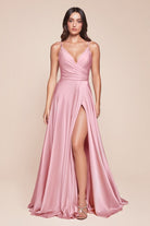 This sophisticated long prom and bridesmaid dress combines refined elegance with contemporary design. Crafted from premium satin, the A-line silhouette provides a universally flattering fit that moves with grace. The deep V-neckline and wrapped bodice create a polished, intentional aesthetic, while sleek straps offer essential support. A leg slit adds modern dimension and ease of movement, and the discreet back zipper ensures a seamless finish. The expertly constructed design delivers the polish and presence expected at formal occasions, making this an investment piece for your special event wardrobe.