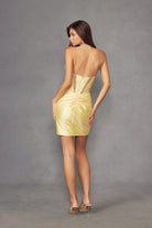 This strapless mini sheath cocktail dress combines sophisticated elegance with eye-catching details. The illusion plunging neckline and sleeveless, strapless silhouette create a modern, flattering look, while rhinestone embellishments add glamorous sparkle to the bodice. Crafted from luxurious satin, the dress features a fitted sheath silhouette that hugs your curves beautifully. The adjustable side waist tie allows for a customized fit, and the convenient zip back closure ensures easy dressing. Perfect for cocktail events, evening parties, or special occasions where you want to make a memorable impression.