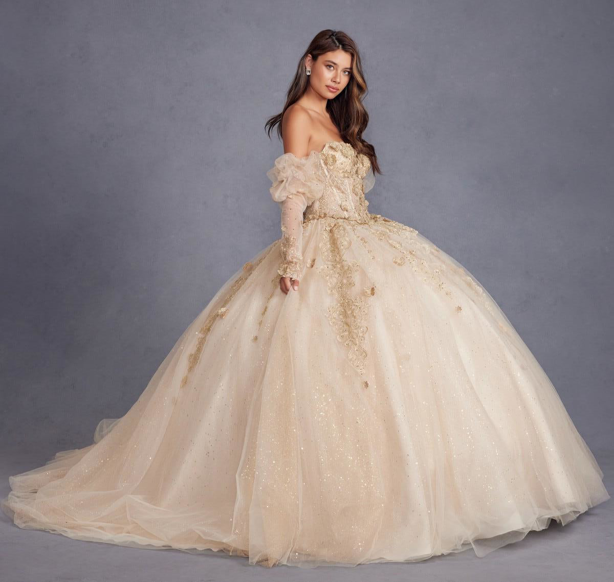 3D Floral Applique Glitter Pattern Embellished Mesh Long Quinceanera Dress GLGL3500