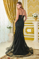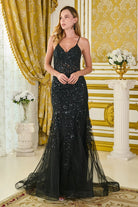Elegant and alluring, this floor-length trumpet gown perfectly balances intricate detail with simplicity. Adjustable spaghetti straps support a sheer V-neck corset bodice, offering both comfort and a flattering fit. The fitted portion of the skirt is richly adorned with embroidery, sequins, and beads, creating eye-catching texture and sparkle. As the skirt flares out, the embellishments soften into a more minimalistic design.