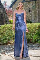 Turn heads in this stunning floor-length gown crafted from luxe stretch satin. Delicate, flower-shaped bead embellishments accent the pleated bust, adding a touch of sparkle. The structured corset bodice features a flattering V-neckline and adjustable spaghetti straps for a customized fit. A Basque waistline highlights the figure, flowing into a fitted skirt with artful ruching on one side. A thigh-high slit adds ease of movement, while gathering at the back enhances the silhouette. Perfect for prom or any formal event, this dress effortlessly combines elegance with allure.