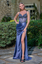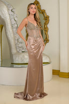 Spaghetti Strapped Prom Soft Satin Gown w/ Sheer Boned Bodice & Gathered Waistline GLGL3696