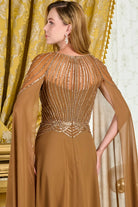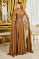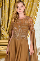 This exquisite A-line gown embodies timeless elegance with its refined silhouette and luxurious details. A scoop neckline frames the face beautifully, while jewel-adorned cape sleeves and mesh bodice create a luminous focal point. The sumptuous chiffon skirt drapes gracefully, allowing fluid movement and an effortless sophistication. The concealed back zipper provides a polished finish and ensures a secure, comfortable fit throughout your special event. Perfect for mothers of the bride or groom, this dress seamlessly blends classic styling with contemporary glamour.