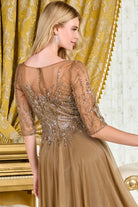 Elegant and timeless, this floor-length A-line mother of the bride/groom dress showcases a beautifully detailed bodice adorned with intricate beadwork, shimmering sequins, and delicate appliqués. The sheer, mesh bodice features a refined boat neckline and flattering 1/2 sleeves, offering elegant coverage. The skirt, crafted from lightweight metallic jersey, flows effortlessly and remains unembellished to highlight the artistry of the bodice. A discreet zip-up back ensures a smooth, secure fit.