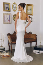 This one-shoulder stretch satin gown captures contemporary bridal elegance through its asymmetrical design and refined construction. The sculpted bodice and strategically placed ruching define the waist while the sheath silhouette glides smoothly over the body in luxurious satin. An artfully draped single shoulder creates visual interest at the neckline, while the streamlined back maintains a polished aesthetic. The fabric's fluid movement and structured stretch ensure both comfort and a sophisticated silhouette. Ideal for formal ceremonies, receptions, intimate celebrations, or professional bridal photography, this gown delivers modern luxury with timeless appeal.