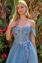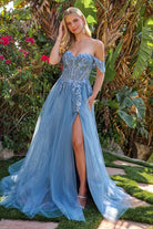 This enchanting A-line gown captivates with its lavish three-dimensional floral appliqués, intricate embroidery, beads, and sequins that dance across the silhouette. Layered over a luminous glitter mesh foundation, the dress radiates brilliance with every movement. The refined sheer corset bodice showcases elegant pleating at the front and a graceful V-neckline, paired with removable off-the-shoulder straps for customizable elegance. A discreet back zipper provides a polished closure, while the sweeping A-line skirt descends to the floor and features a daring thigh-high slit. An impeccable selection for prom or formal occasions seeking timeless sophistication with a touch of magic.