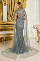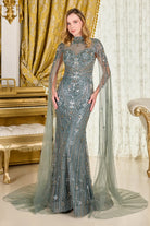 Make a sophisticated statement in this stunning mother of the bride/groom gown, richly adorned with sparkling beads and sequins for an elegant, refined look. An embellished mock neckline flows seamlessly into graceful cape sleeves, leading to a fitted silhouette that is designed to flatter. A concealed back zipper ensures a smooth, polished finish.