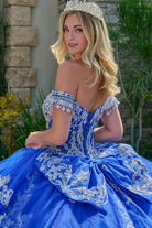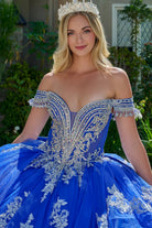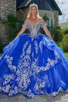 Off The Shoulder Maxi Tulle Quinceanera Gown w/ Cascading Ruffled Train & Jewel Lace GLGL3805