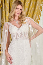Exquisite details and a flattering fit define this trumpet-style wedding gown, featuring intricate appliqués, sparkling beads, sequins, and embroidery, enhanced by a subtle glitter underlayer. Sheer mesh cape sleeves attach to the flattering V-neckline corset bodice, while the back mirrors the front with a V-shaped design. The fit-and-flare skirt flows smoothly into a small train, creating a sophisticated and streamlined bridal silhouette.