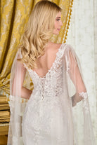 Embellished v neckline corset bodice cape sleeves trumpet wedding dress with train GLGL3829
