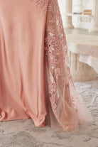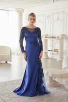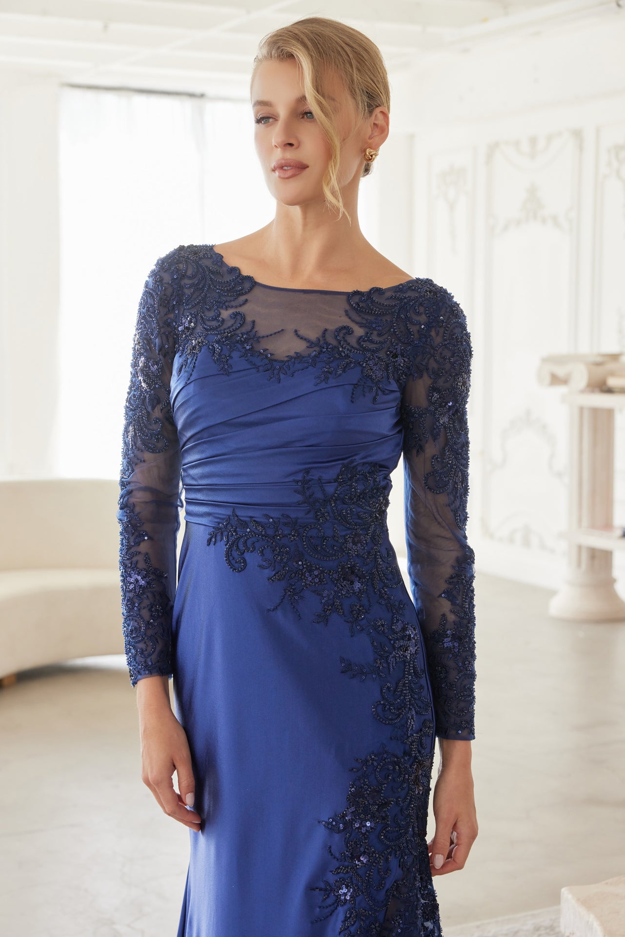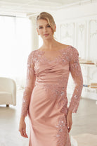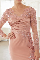 THIS ELEGANT MOTHER OF THE BRIDE DRESS IS CRAFTED FROM A LUXURIOUS SATIN MATERIAL. IT FEATURES LONG SLEEVES AND A PLEATED WAISTLINE FOR A FLATTERING, FIGURE-SKIMMING SILHOUETTE. THE CHEST AREA AND ILLUSION SLEEVES ARE BEAUTIFULLY ADORNED WITH A BEADED AND SEQUINED APPLIQUE, ADDING A TOUCH OF GLAMOUR. THE DRESS ALSO BOASTS A STUNNING KEYHOLE DESIGN IN THE BACK, CREATING AN ALLURING, MODERN FINISH. STRETCH MATERIAL!